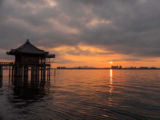 近江八景「堅田の落雁」で知られる湖上の仏堂で、正式名称は「海門山満月寺浮御堂」。琵琶湖にせり出すように建てられた木造の御堂が、水面に映える姿はまさに絶景。歴史と自然が融合した神秘的な雰囲気が漂います。