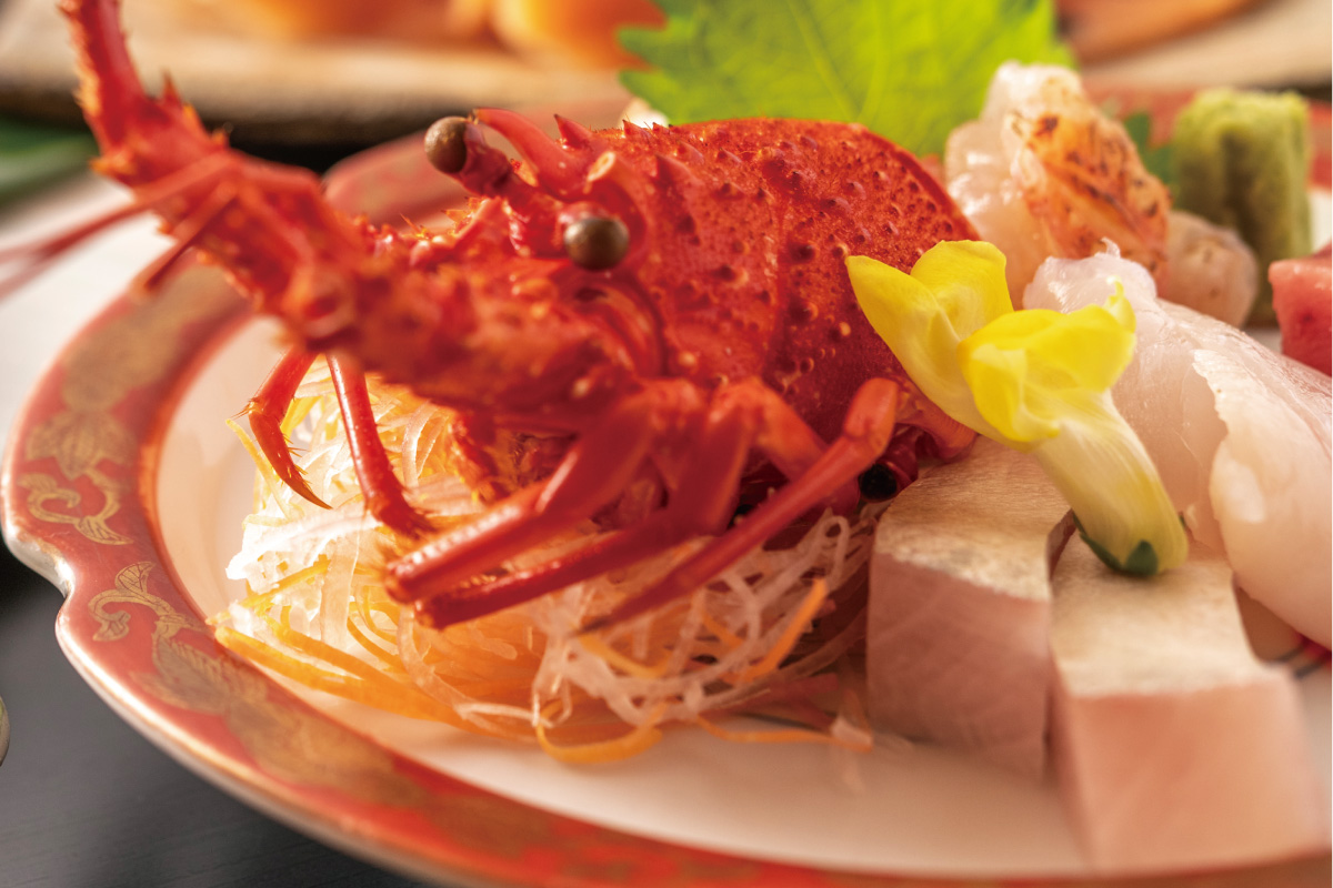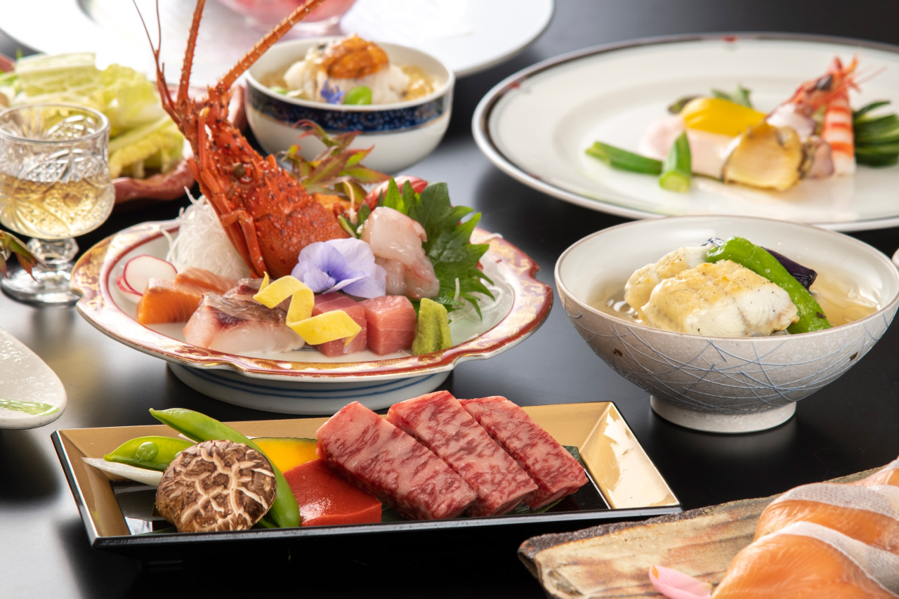 ぷりっぷりの伊勢海老のお刺身と、甘みを増した旬の京野菜と鰻にとろりと餡をかけた一品、A5認証近江牛ステーキがメイン。料理長自慢の創作会席です。