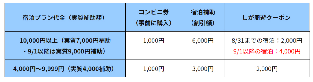 - ※コンビニ券上に記載の滋賀周遊クーポンの配布金額は、9/1以降の宿泊については、上記一覧表に記載金額が適用になります。